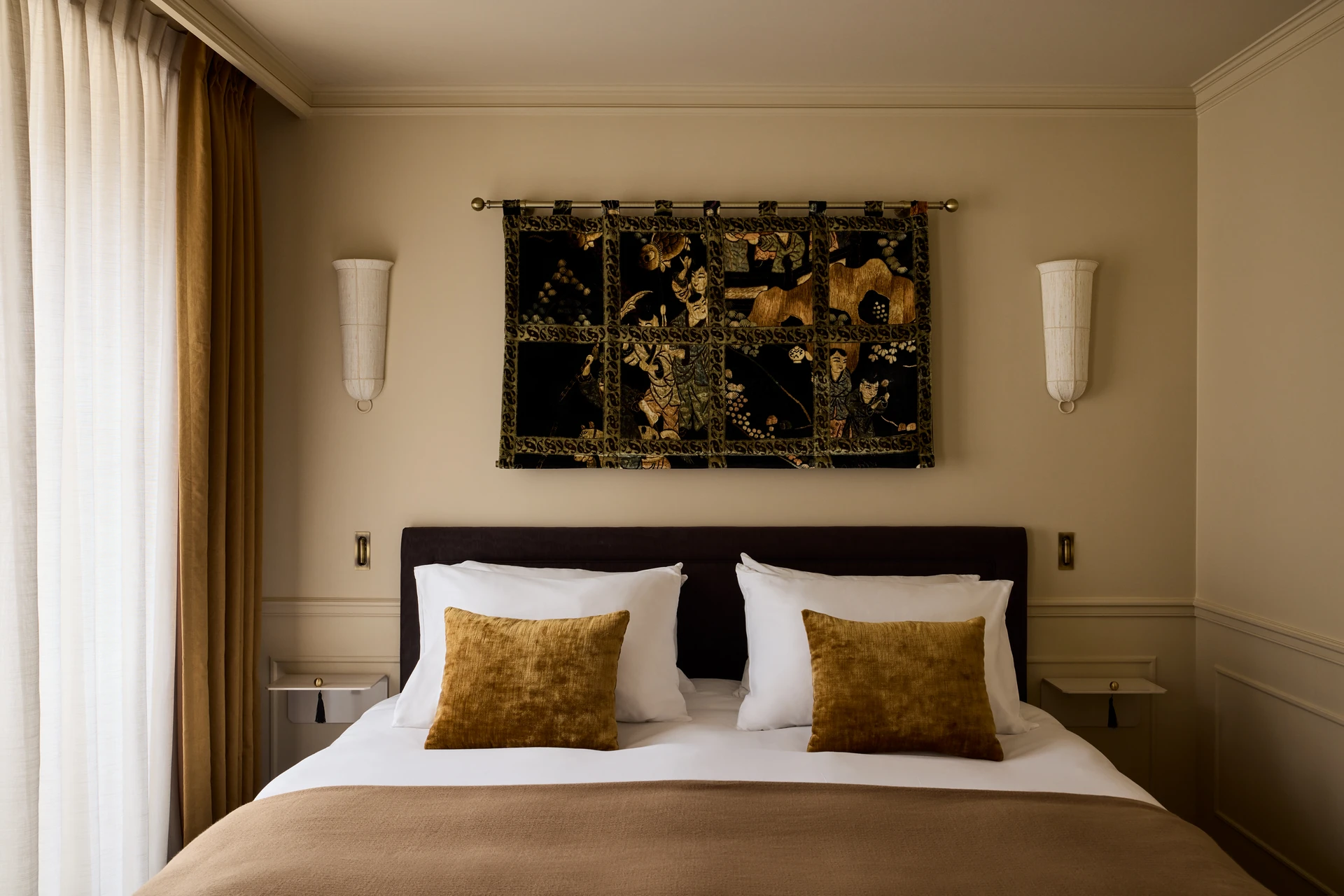 Dans les six étages, les chambres prolongent cette esthétique intime. Moquette brune épaisse de la Manufacture Pinton, placards laqués et miroirs mercerisés, banquettes à franges, tentures murales Arjumand, composent un univers à la fois apaisant et mystérieux. Les salles de bains, à l’esprit résolument parisien, associent les marbres Botticino et Rosso Verona, dans un contraste chaleureux et lumineux. Chaque espace cultive un luxe silencieux, traversé de reflets et de symboles, à l’image de l’opale noire, pierre de transformation et de mystère.