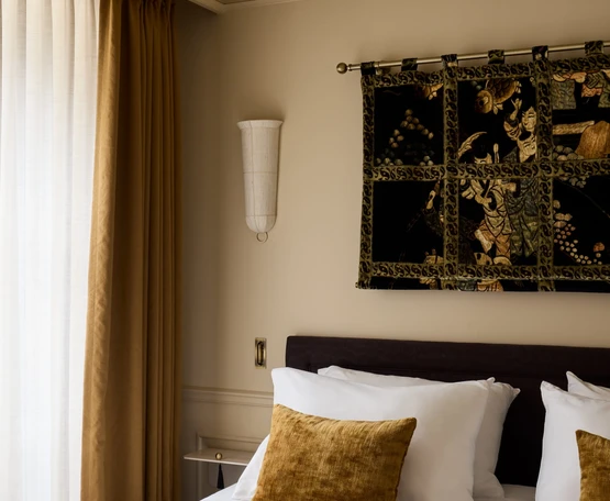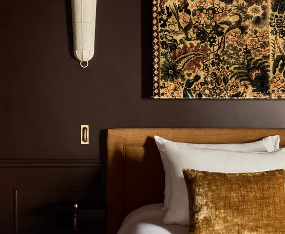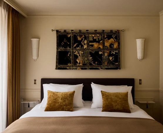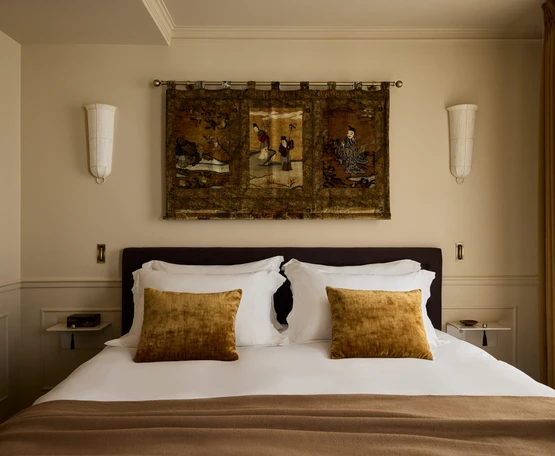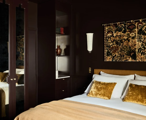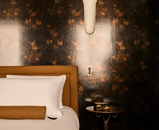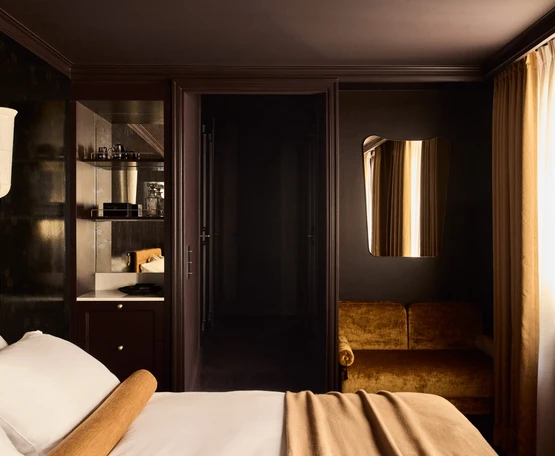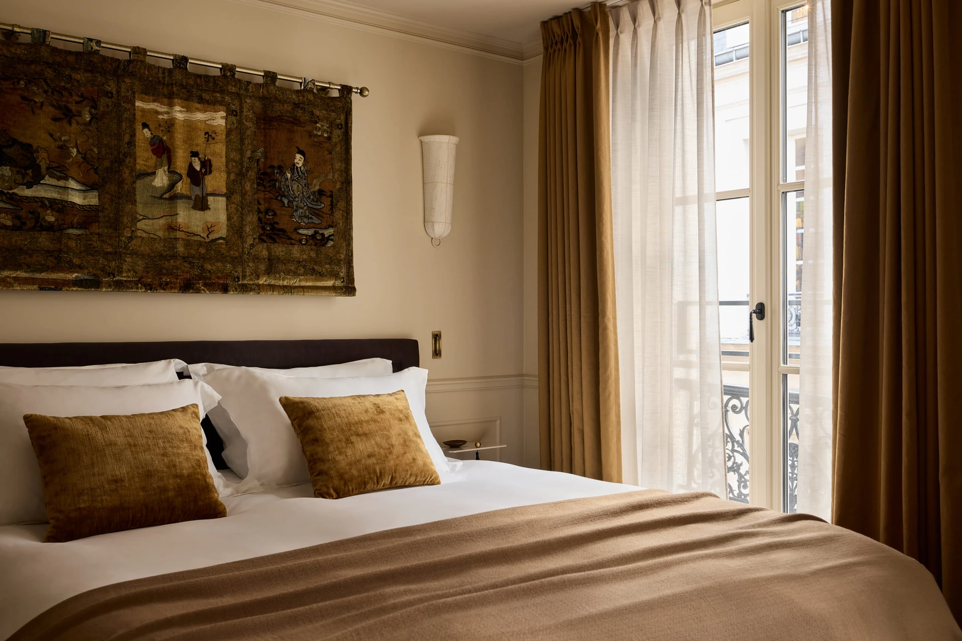 Across the six floors, the rooms extend this intimate aesthetic. Thick brown carpet from La Manufacture Pinton, lacquered closets and mercerized mirrors, fringed benches, and Arjumand wall hangings create a universe that is both soothing and mysterious. The bathrooms, with a decidedly Parisian spirit, combine Botticino and Rosso Verona marbles in a warm and luminous contrast. Each space cultivates a quiet luxury, filled with reflections and symbols, akin to the black opal, a stone of transformation and mystery.